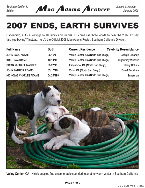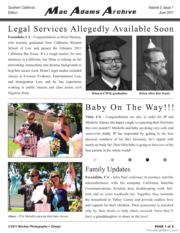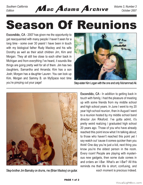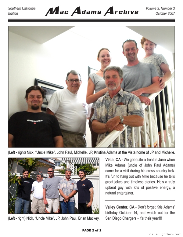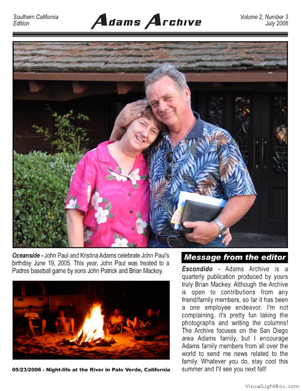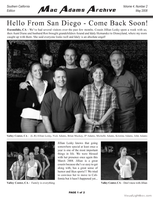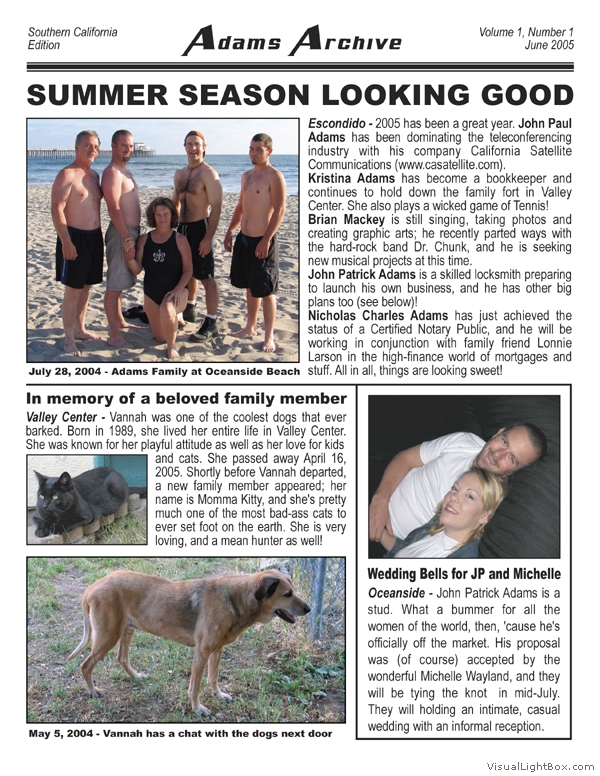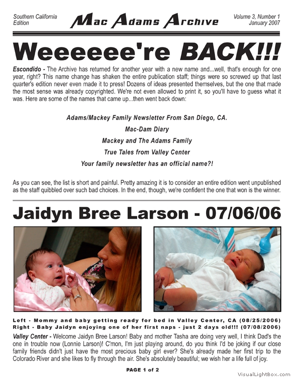 The MacAdams Archive sprouted in June 2005 with the intention of spreading good news from Southern California to family members throughout the country (and beyond). It has grown to include a plethora of unique family photos, stories, and trivia nuggets such as family-member celebrity resemblances. We attempt to publish three Issues per annual Volume; we have met this goal twice since the Archive came to life. The staff is known to regularly take unscheduled haitus, making it all but impossible to predict exactly when the next issue will arrive - but rest assured that the Archive will continue to grow. Tap the thumbs to see the full-size issues :