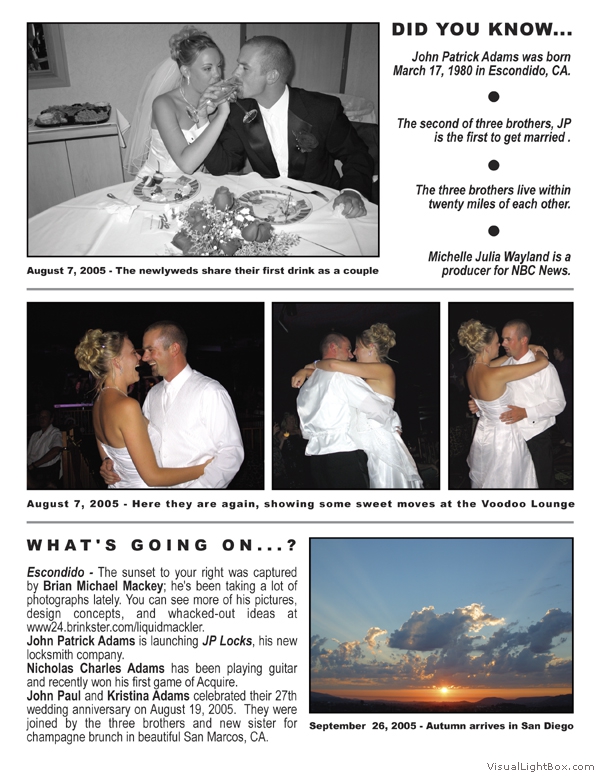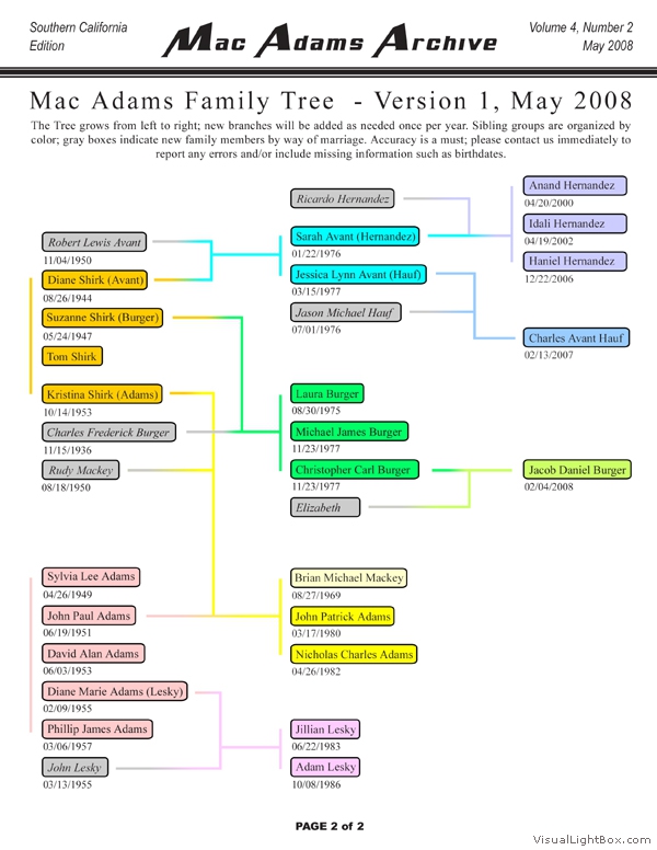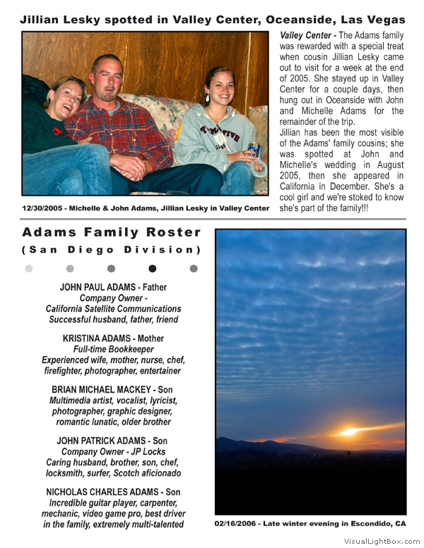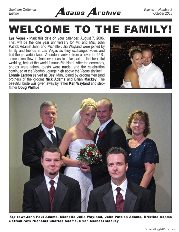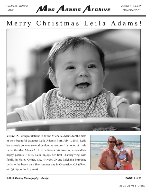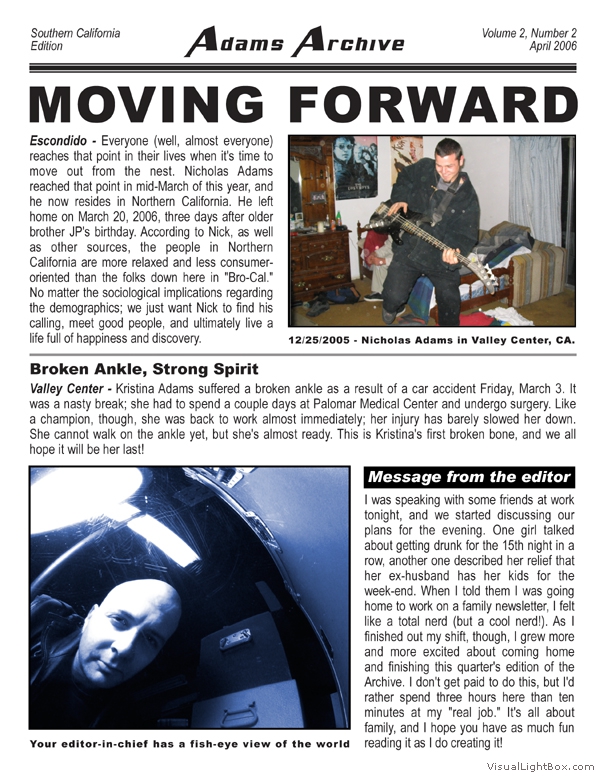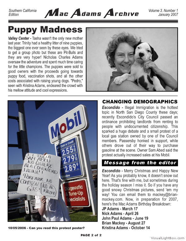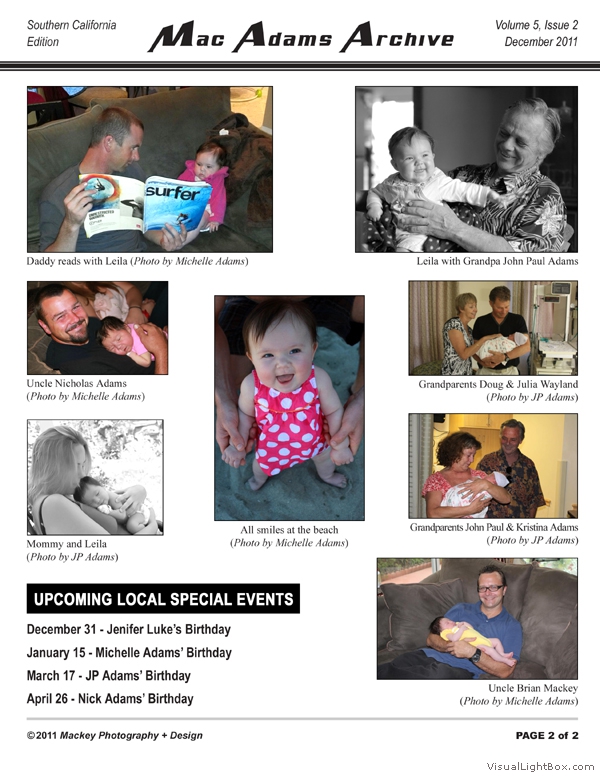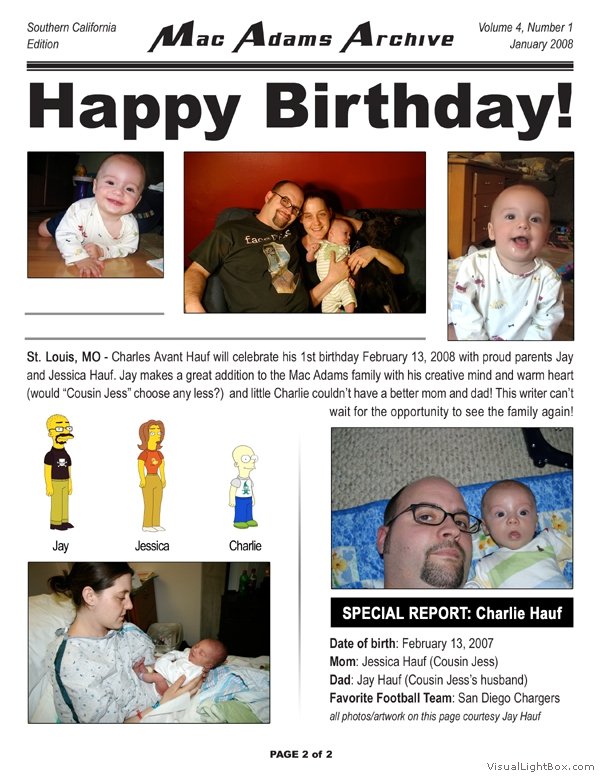 The MacAdams Archive sprouted in June 2005 with the intention of spreading good news from Southern California to family members throughout the country (and beyond). It has grown to include a plethora of unique family photos, stories, and trivia nuggets such as family-member celebrity resemblances. We attempt to publish three Issues per annual Volume; we have met this goal twice since the Archive came to life. The staff is known to regularly take unscheduled haitus, making it all but impossible to predict exactly when the next issue will arrive - but rest assured that the Archive will continue to grow. Tap the thumbs to see the full-size issues :